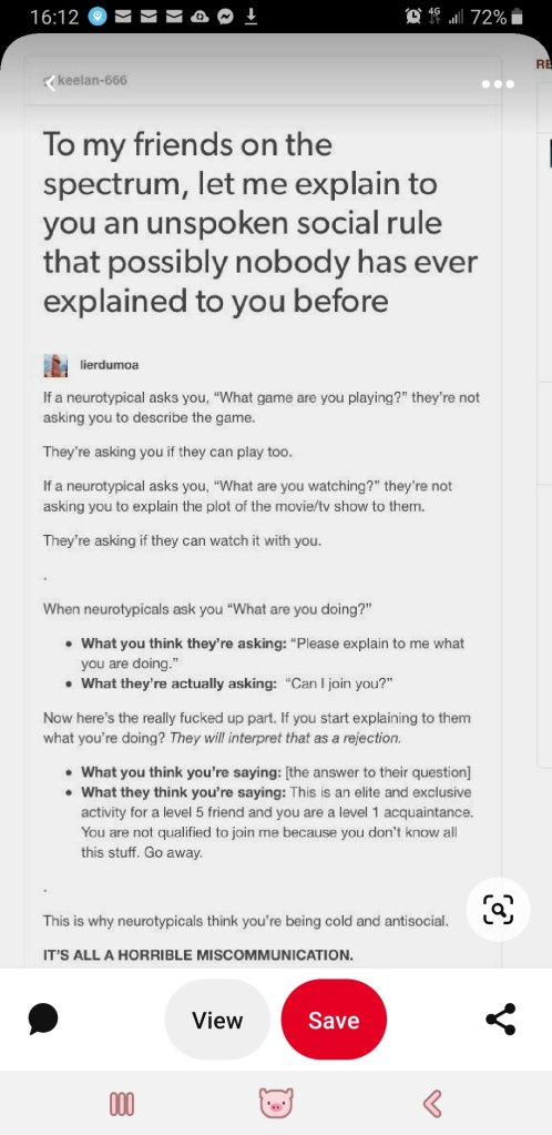 I’ve been seeing quite a few of these “To my autistic friend” or “to my friend on the spectrum” notes that are trying to give some kind of magical equation or secret code for understanding the non verbal or coded or paralanguage of a neurotypical person. There is so much to unpack with these posts that it makes my head spin. I’m going to dig into it, but I’m just going to hit the highlights here or this post will end up being really long.