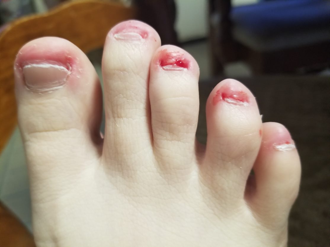 Personally, I have struggled with trichotillomania, dermatillomania, and onychophagia for as long as I can recall. The worst of the three for me has been the onychophagia. I would bite my nails until they bled. The nail biting would frequently cause infections. My fingers were in constant pain. But none of that mattered, I still felt compelled to bite them more. Acrylic nails have been my way out of that behavioral cycle. But it’s not just my finger nails. Here is a couple pictures of my toes. This is what BFRB looks like.