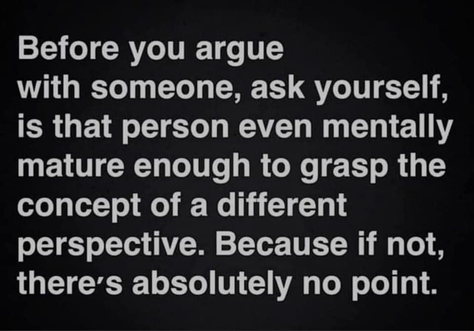 Black square with the following text: “Before you argue with someone, ask yourself. is that person even mentally mature enough to grasp the concept of a different perspective. Because if not, there’s absolutely no point.”