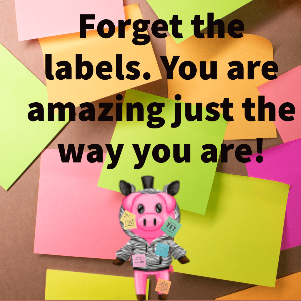 Background is a cork board covered in sticky notes. There is a pig wearing a zebra hoodie that has sticky notes stuck all over him. Text at the top of the picture reads: Forget the labels. “You are amazing just the way you are!”