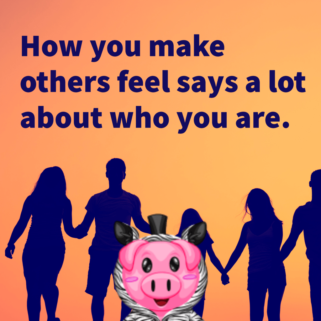 Silhouettes of people holding hands in the background. In the fore ground is a pig wearing a zebra hoodie smiling. Text at the top reads: “How you make others feels says a lot about who you are.”