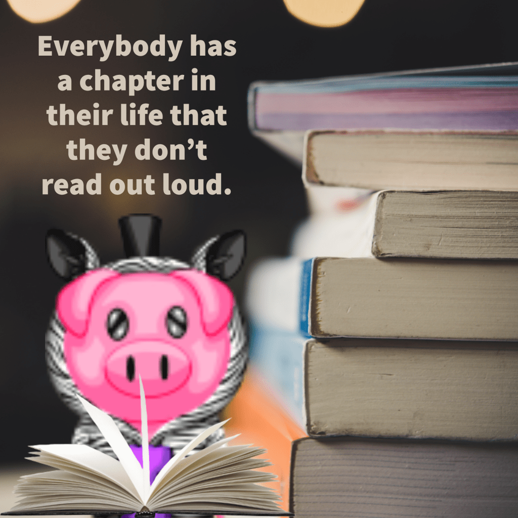 Out of focus background. To the right there is a large stack of books. To the left there is a pig wearing a zebra hoodie and holding a mug with an open book in front of him. Text in the upper left corner reads: “Everybody has a chapter in their life that they don’t read out loud.”