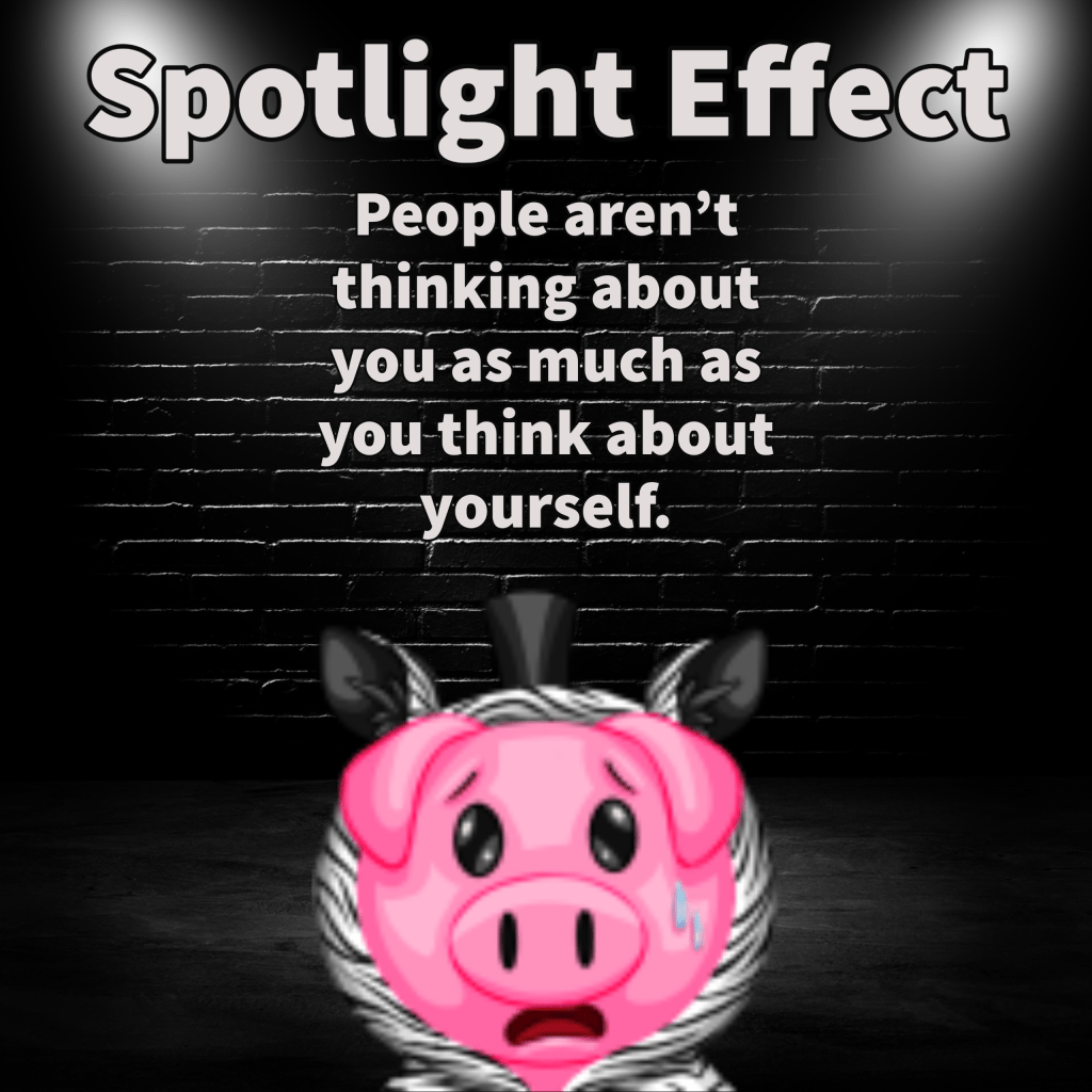 Black background with spotlights in both upper corners shining down onto a pig in a zebra hoodie who is looking stressed out. Text at the top reads: “Spotlight effect: People aren’t thinking about you as much as you are thinking about yourself.”
