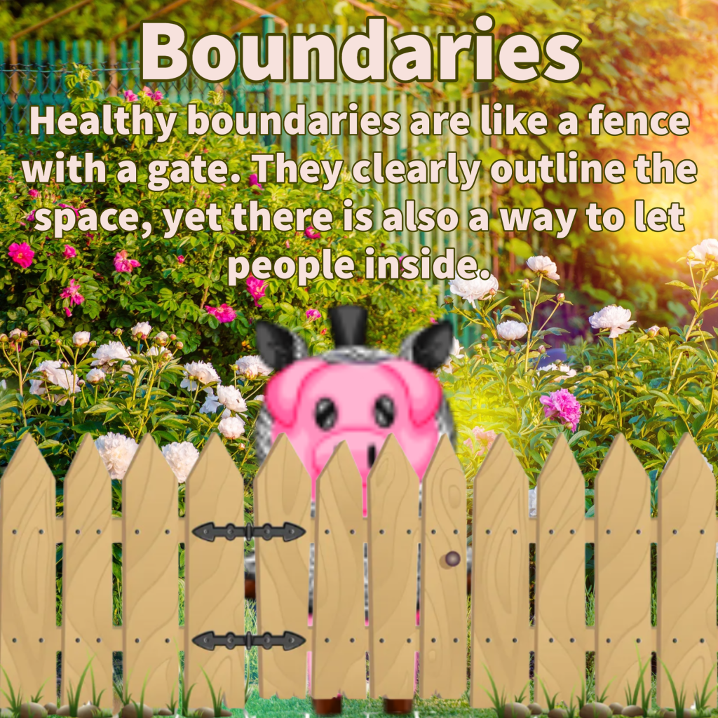 Picture of a garden in the background. In the fore ground there is a pig in a zebra hoodie standing behind a wooden fence with a gate that surrounds the garden. The text at the top reads: Boundaries. Healthy boundaries are like a fence with a gate. They clearly outline the space, yet there is also a way to let people inside.”