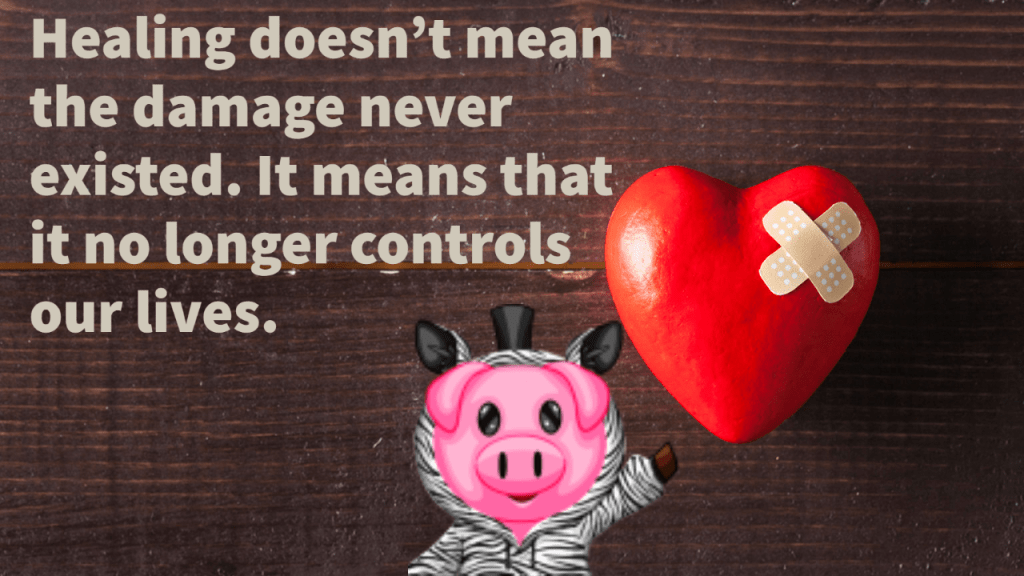 Picture of a pig wearing a zebra hoodie pointing to a heart with band aids on it. Text reads: “Healing doesn’t mean the damage never existed. It means that it no longer controls our lives.”