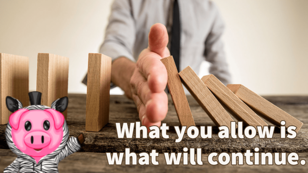 Image of a person holding their had in a line of falling dominos to keep the next ones from falling over. Text reads: “What you allow is what will continue.”