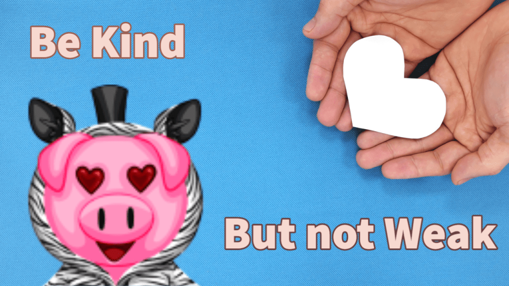 In bottom left corner there is a pig in a zebra hoodie with heart eyes. In the top right corner there are hands holding out a heart towards the pig. Text reads: “Be kind, but not weak.”