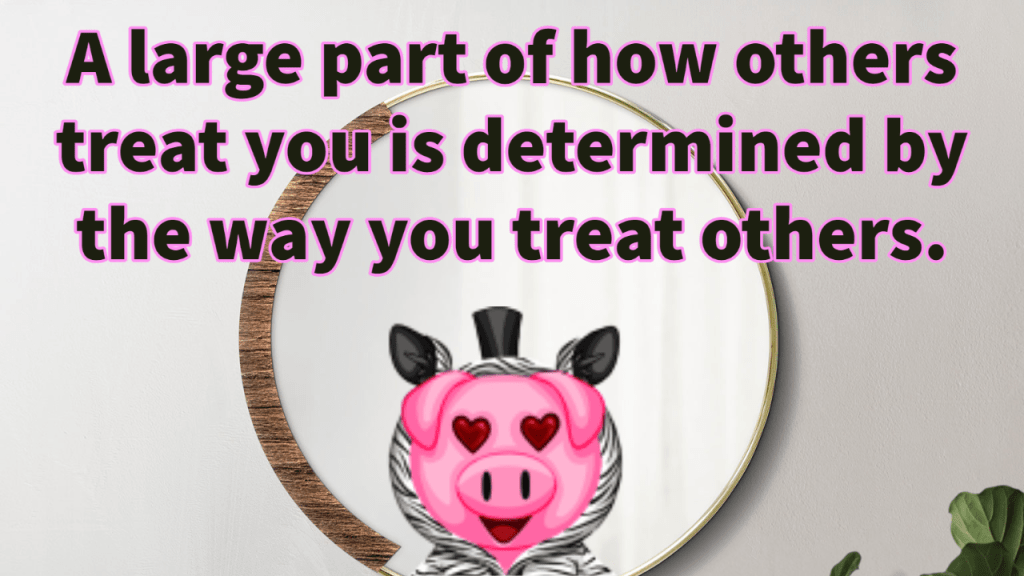 A picture of a pig wearing a zebra hoodie as a reflection in a mirror. Text reads: “A large part of how others treat you is determined by the way you treat others.”