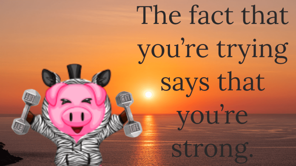 Background of a sunset. In the foreground there is a pig in a zebra hoodie holding weights. Text reads: “The fact that you’re trying says that you’re strong.”
