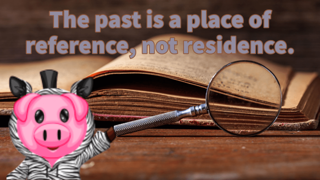 An old book with a magnifying glass that a pig wearing a zebra hoodie is pointing to. Text reads: “the past is a place of reference, not residence.”
